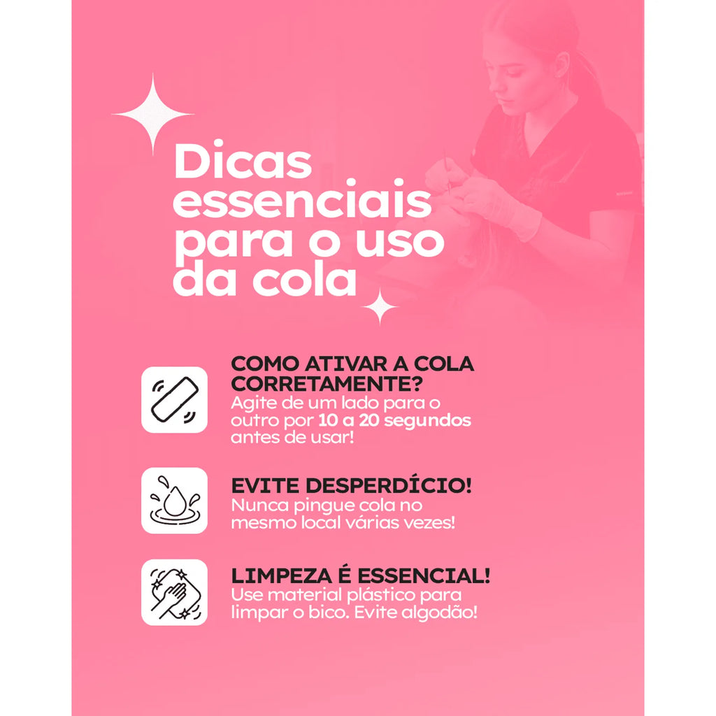 Use uma pequena quantidade do produto nos cílios a serem colados e, em seguida, coloque-os nos cílios naturais.