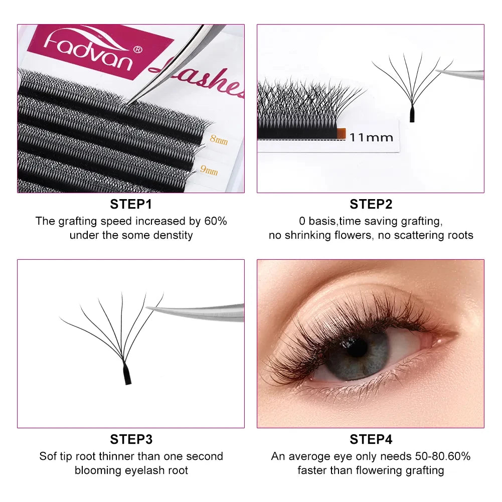 Investindo nos fios da Fadvan, você terá 6 fios unidos em 1 só, sendo 2 para cada lado e um central e cada um com pontas duplas tendo 6 pontas para criar um efeito volumoso de maneira leve. O resultado são cílios mais naturais, sedosos e de alta qualidade além de serem feitos cuidadosamente e a mão.