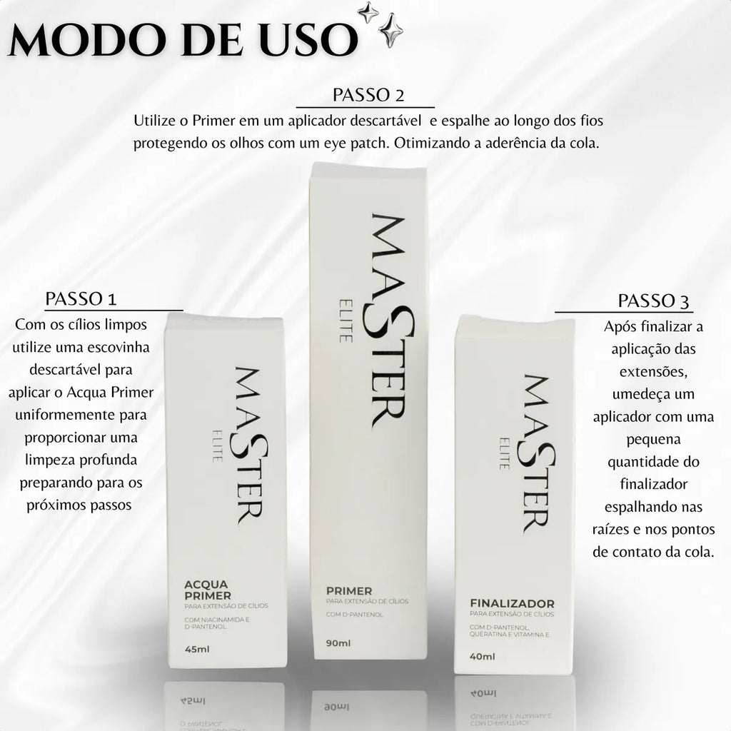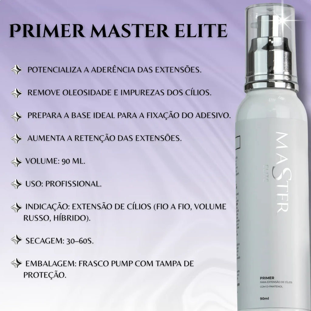 O Kit Retenção Master é o segredo para extensões de cílios com máxima durabilidade e saúde dos fios. Composto por Primer, Acqua Primer e Finalizador, ele prepara, equilibra e sela os fios, garantindo aderência superior da cola, hidratação e acabamento perfeito.