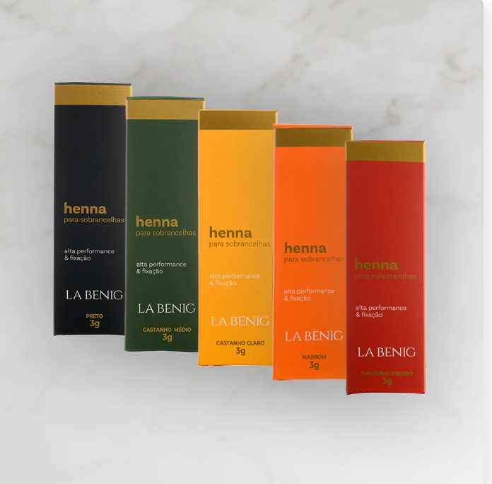 A Henna para sobrancelhas La Benig ressalta a beleza das sobrancelhas proporcionando um aspecto natural e um resultado maravilhoso sem agressão aos pelos e a pele. Ela é dermatologicamente testada, segue todos os critérios da Anvisa e vigilância Sanitária. Com cinco opções de tonalidade abraçando a diversidade de coloração e texturas das peles Brasileiras.